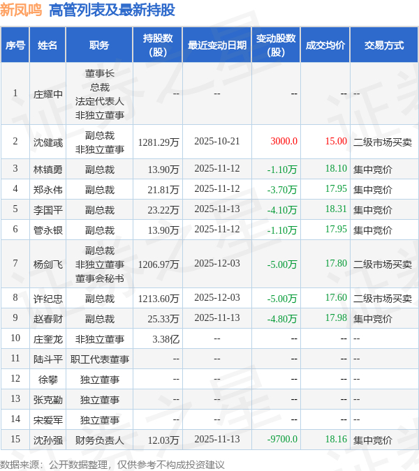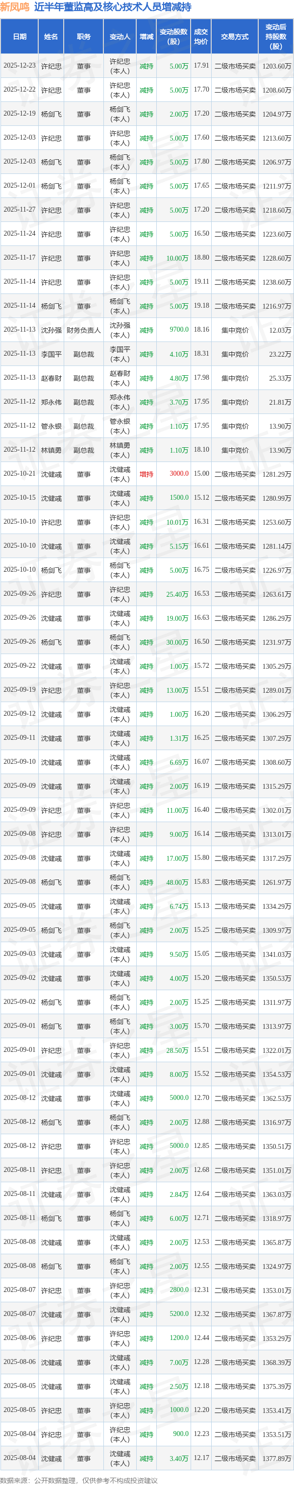 证券之星消息,根据12月24日市场公开信息、上市公司公告及交易所披露数据整理,新凤鸣(603225)最新董监高及相关人员股份变动情况:2025年12月23日公司董事许纪忠共减持公司股份5.0万股,占公司总股本为0.0033%。变动期间公司股价上涨0.34%,12月23日当日收盘报17.65元。