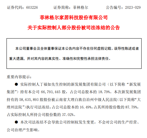 菲林格尔称,此次司法冻结不会导致公司控制权发生变更,不会对公司生产经营、公司治理产生影响。