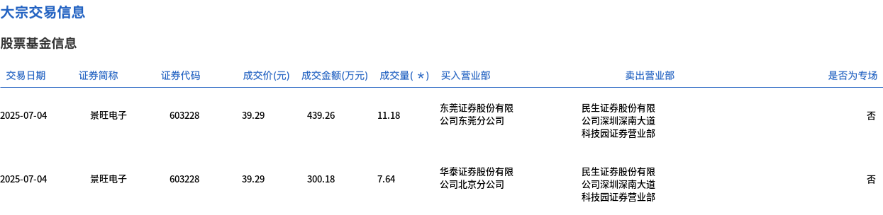 景旺电子今日大宗交易折价成交18.82万股,成交额739.44万元
