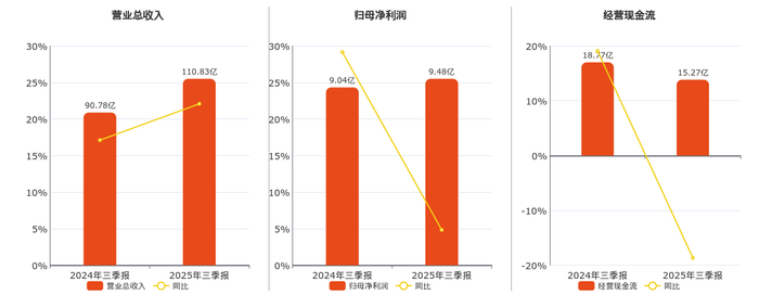 公司营业总收入为110.83亿元。归母净利润为9.48亿元。经营活动现金净流入为15.27亿元,较去年同报告期经营活动现金净流入减少3.50亿元,同比较去年同期下降18.65%。
