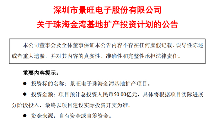 2025年8月23日,景旺电子为迎接AI浪潮下全球科技产业供应链重构机遇,加速在AI算力、高速网络通讯、汽车智驾、AI端侧应用等领域的高端产品布局,满足全球客户的中长期、高标准需求,提升公司在高端产品的竞争优势,拟使用自有资金或自筹资金50亿元对景旺电子珠海金湾基地进行扩产投资。