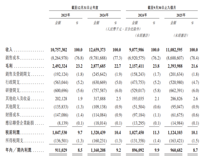 业绩方面,于2023年、2024年及2025年前9个月,景旺电子实现收入分别约为107.57亿元、126.59亿元、110.83亿元;录得利润分别约为9.11亿元、11.6亿元、9.61亿元。