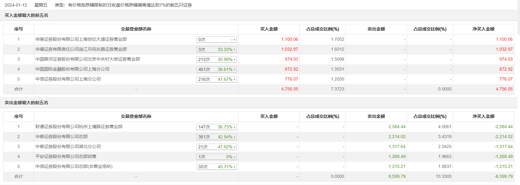 1月12日,索宝蛋白今日跌8.97%,全天换手率达52.62%,振幅达13.24%。龙虎榜数据显示,营业部席位合计净卖出3843.74万元。其中,财通证券杭州上塘路证券营业部、华泰证券总部分别卖出2584.44万元、2214.02万元;申港证券上海世纪大道证券营业部、华福证券连江丹凤东路证券营业部分别买入1100.06万元、1032.97万元。
