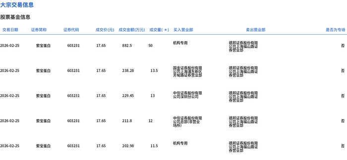 2月25日,索宝蛋白大宗交易成交100万股,成交额1765.01万元,占当日总成交额的23.62%,成交价17.65元,较市场收盘价19.18元折价7.98%。