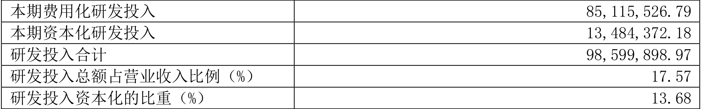 2023年全年,公司研发投入金额为9859.99万元,同比增长6.29%;研发投入占营业收入比例为17.57%,相比上年同期上升3.50个百分点。此外,公司全年研发投入资本化率为13.68%。