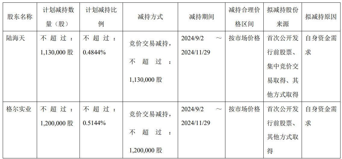 公告显示,陆海天持有公司股份19,147,695股,占公司总股本比例为8.2068%,格尔实业持有公司股份19,629,252股,占公司总股本的比例为8.4132%。