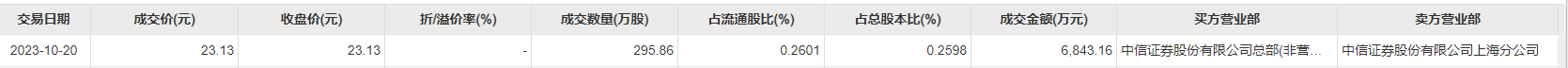 收跌0.47%,收盘价为23.13元,发生1笔大宗交易,合计成交量295.86万股,成交金额6843.16万元。