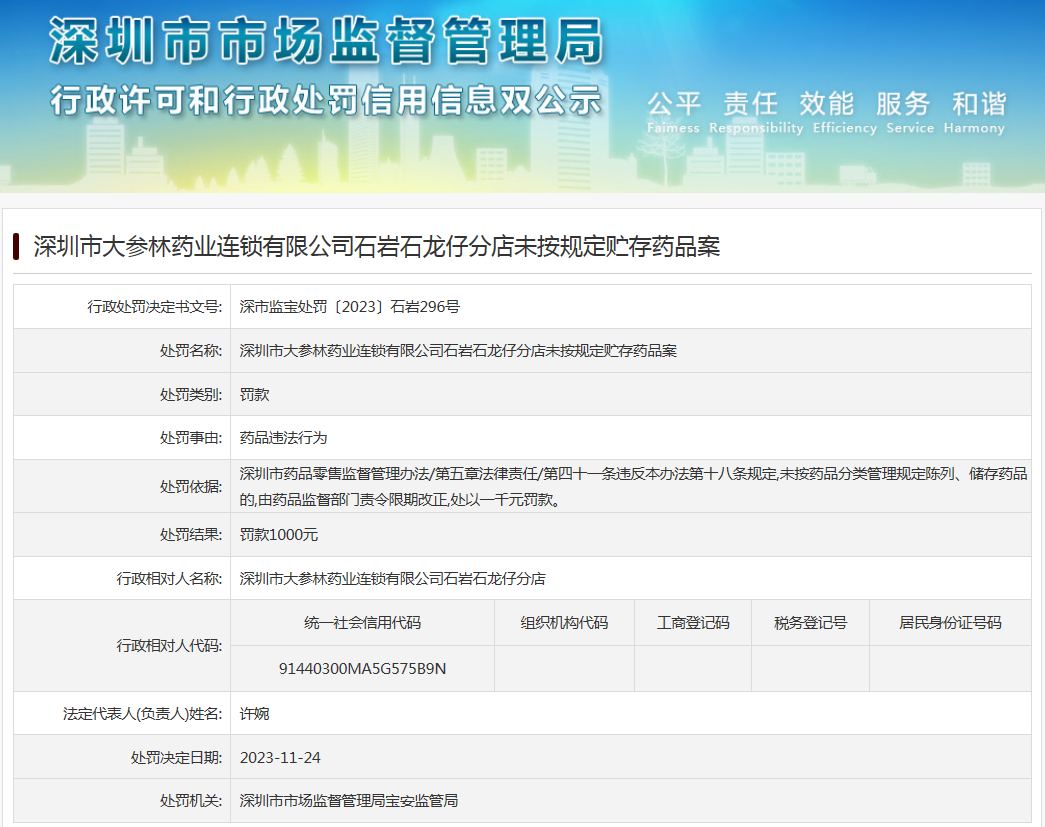 深圳市大参林药业连锁有限公司石岩石龙仔分店未按规定贮存药品案