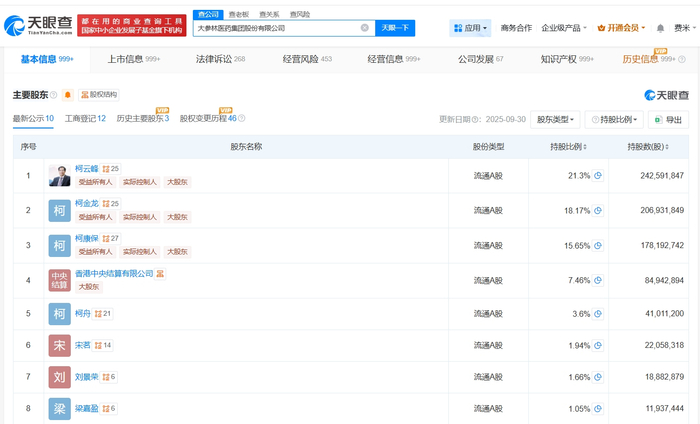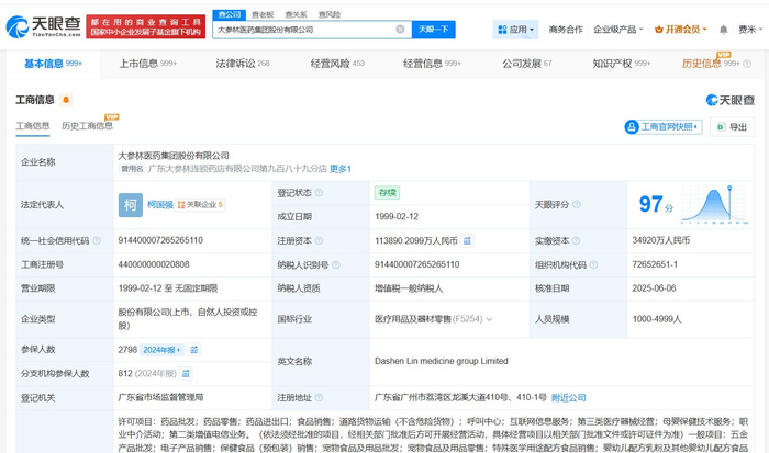 天眼查App显示,涉事企业大参林医药集团股份有限公司成立于1999年2月,法定代表人为柯国强,注册资本约11.4亿人民币,经营范围包括药品批发、药品零售、药品进出口等,由柯云峰、柯金龙、柯康保等共同持股。法律诉讼信息显示,该公司曾多次因产品责任纠纷、买卖合同纠纷等被起诉。