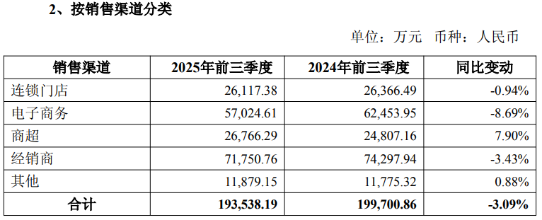 按销售渠道看,公司商超销售增7.90%,其他销售增0.88%,剩余的销售渠道均有不同程度下滑,连锁门店销售跌0.94%,电子商务销售跌8.69%,经销商销售跌3.43%。