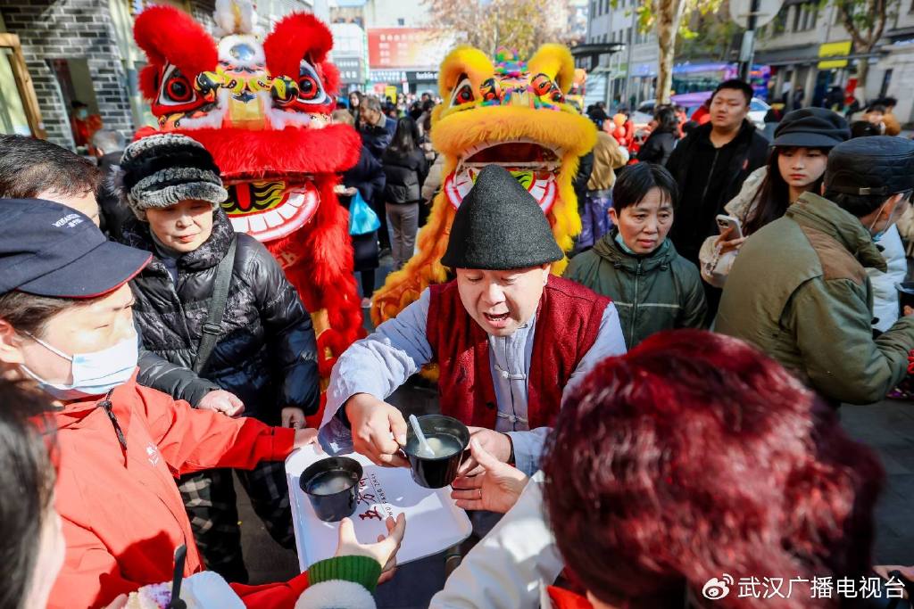 当天,武汉五芳斋总店外的“汤圆铺”热闹非凡。汤圆师傅揭开汤锅盖子,热气裹挟着甜香扑面而来,现场市民争相领取“2026年第一锅汤圆”。拿到汤圆的人纷纷举着碗拍照,分享这份新春头份甜。一场红火热烈的舞龙舞狮正将气氛推向高潮——长龙随着鼓点翻飞腾跃,醒狮摇头摆尾、眨眼腾挪,引来阵阵喝彩。五芳斋负责人与市民代表共同切分大型生日蛋糕,把80周年的甜蜜与福气传递给在场每个人。