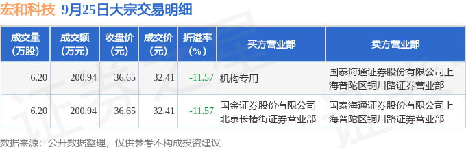 证券之星消息,9月25日宏和科技发生大宗交易,交易数据如下:
