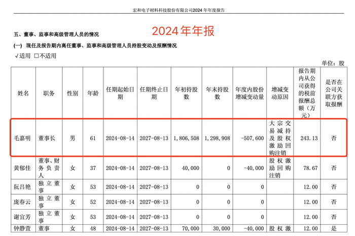 薪酬方面,2024年,董事长毛嘉明的年薪为243.13万元,较2023年的142.71万元增长100.42万元,增幅约70.38%。