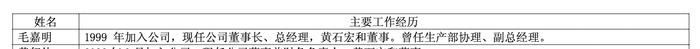 资料显示,毛嘉明,现年62岁,1999年加入公司,现任公司董事长、总经理,黄石宏和董事。曾任生产部协理、副总经理。