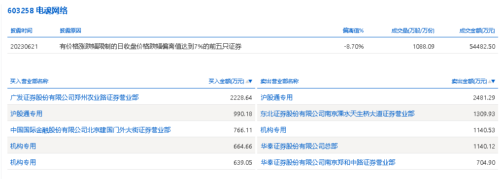 6月21日,电魂网络今日跌停,龙虎榜数据显示,上榜营业部席位全天成交1.21亿元,占当日总成交金额比例为22.15%。其中,买入金额为5288.64万元,卖出金额为6776.78万元,合计净卖出1488.14万元。