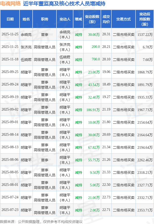 电魂网络近半年内的董监高及核心技术人员增减持详情如下: