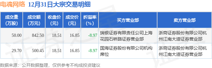 12月31日电魂网络发生2笔大宗交易 成交金额1342.95万元