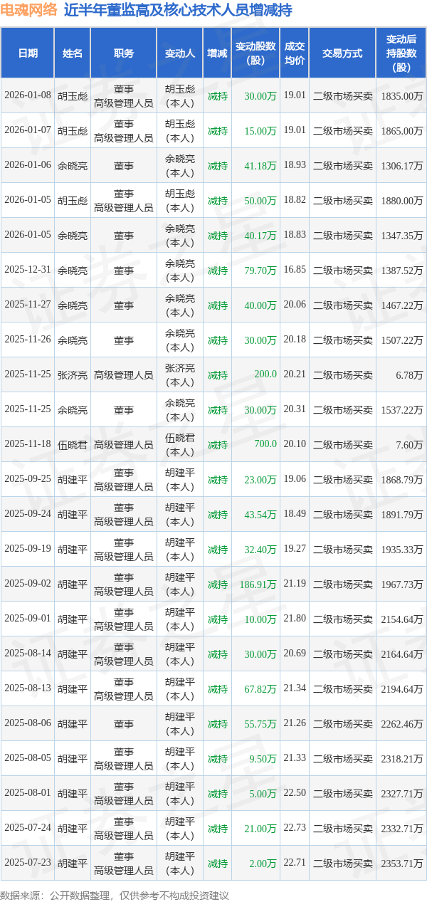 电魂网络近半年内的董监高及核心技术人员增减持详情如下: