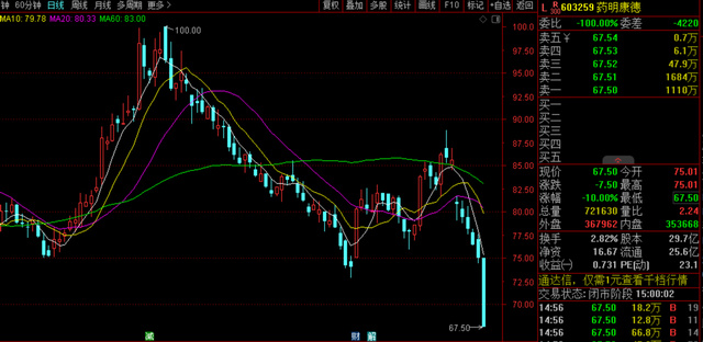 4月25日,药明康德低开低走,午后跌停,值得一提是,午后两点,大盘大幅反弹,但药明康德趴在跌停板纹丝不动,资金抄底愿意不强。截止收盘,药明康德报于67.5元,总市值为2003亿。