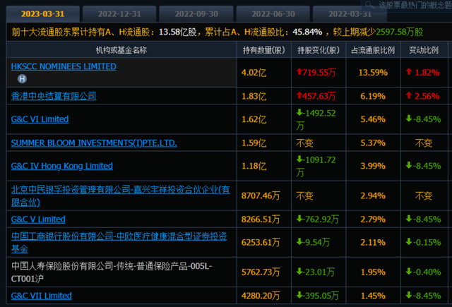 2023年一季报显示:最新的持仓机构数为404家(更新中),累计持股数为13.79亿。