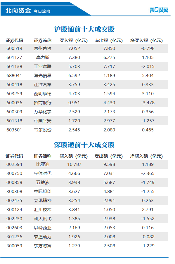 前十大成交股中,净买入额居前三的是海光信息、药明康德(维权)、汇川技术,分别获净买入5.4亿元、3.11亿元、2.79亿元。