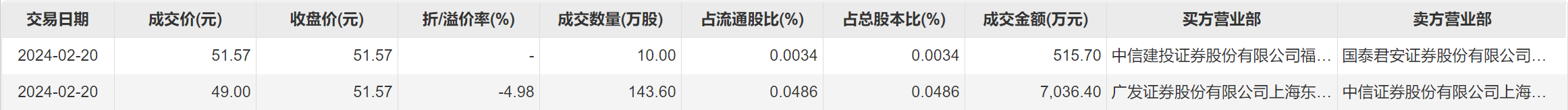 药明康德(维权)2月20日大宗交易成交153.6万股,成交额7552.1万元,占当日总成交额的1.46%,成交均价49.17元,较市场收盘价51.57元折价4.65%,其中最高成交价51.57元,最低成交价49元。