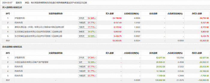 3月7日放量跌停,沪股通卖出6.21亿元并买入2.47亿元,三机构合计卖出近4亿元,