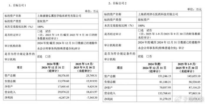 两家公司在2025年前三季度合计收入11.65亿元,占集团营收3.55%,合并净利润0.86亿元,占同期利润0.72%。其中,康德弘翼亏损7545万元,药明津石盈利1.62亿元。