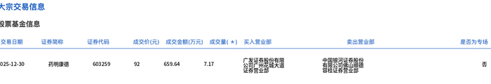 12月30日,药明康德大宗交易成交7.17万股,成交额659.64万元,占当日总成交额的0.23%,成交价92元,较市场收盘价91.9元溢价0.11%。