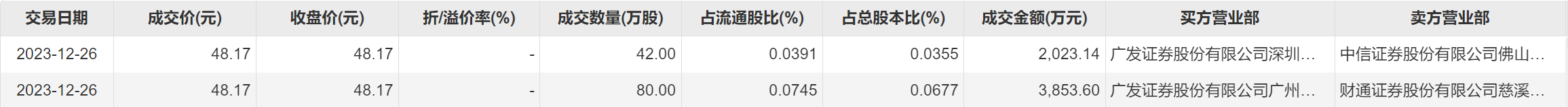 今日大宗交易成交122万股,成交额5876.74万元,占当日总成交额的26.39%,成交价48.17元,较市场收盘价持平。