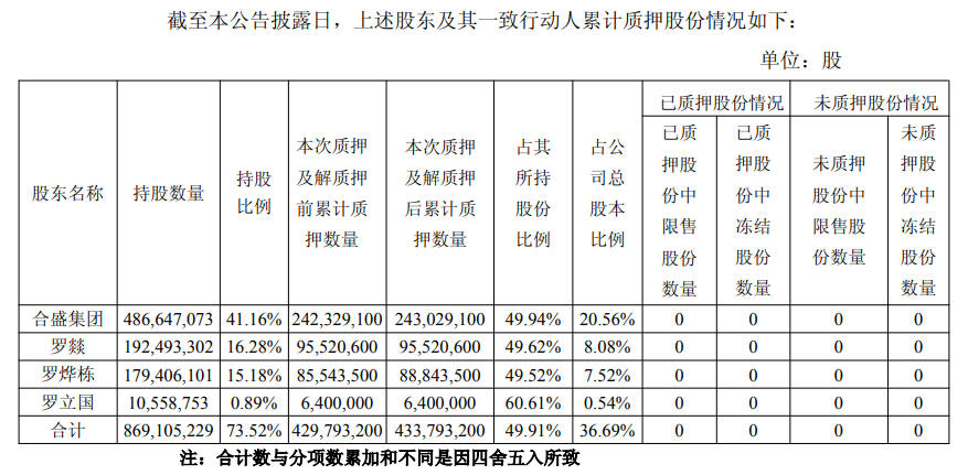 合盛集团及其一致行动人罗燚、罗华栋和罗立国合计持有869,105,229股,占公司总股本的73.52%,本次质押及解质押后累计质押数量433,793,200股,占其所持股份的49.91%,占公司总股本的36.69%。