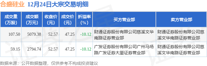 12月24日合盛硅业现2笔折价10.12%的大宗交易 合计成交7874.12万元