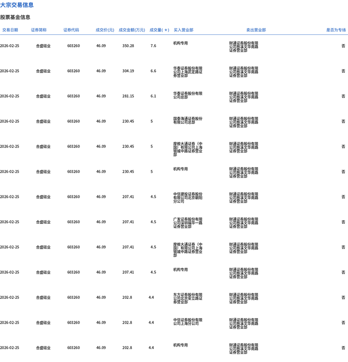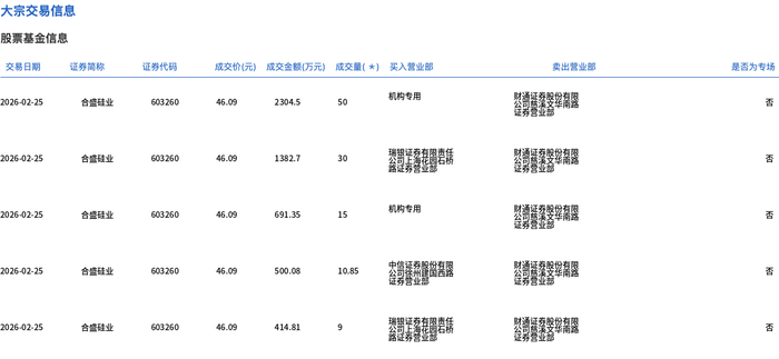 2月25日,合盛硅业大宗交易成交181.35万股,成交额8358.45万元,占当日总成交额的7.17%,成交价46.09元,较市场收盘价52.57元折价12.33%。