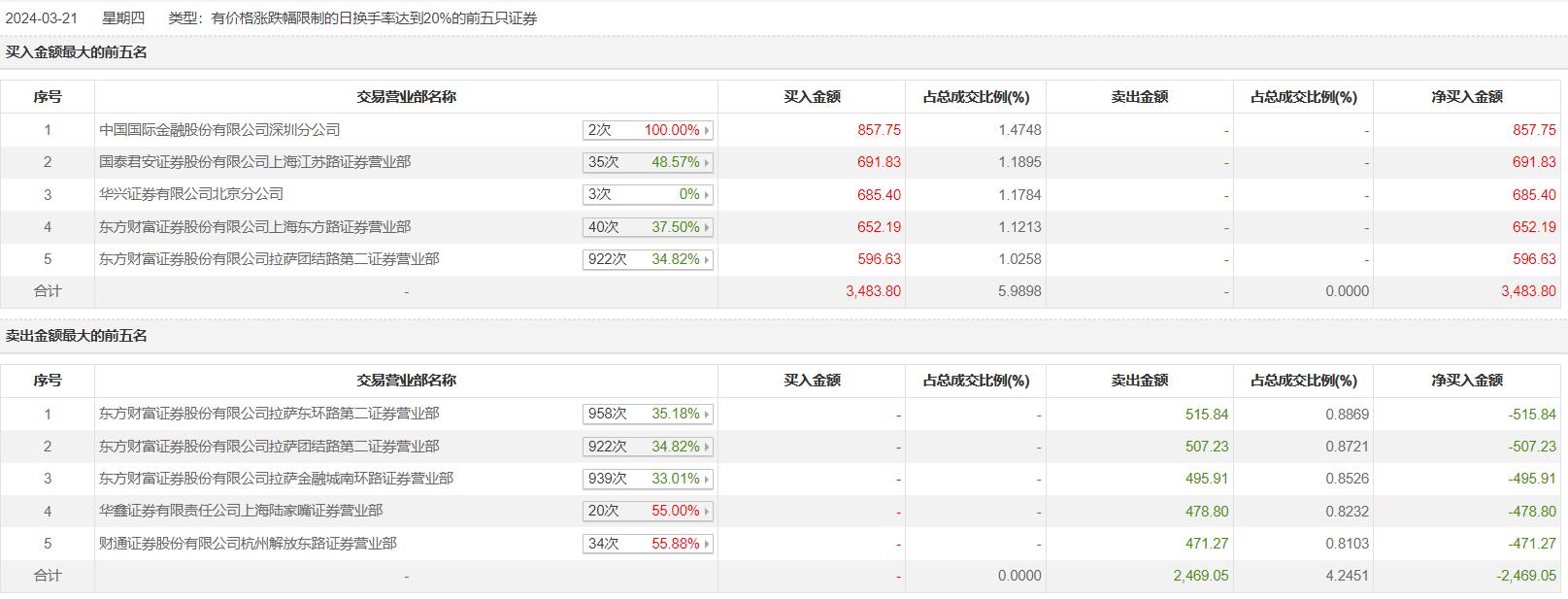 具体来看,知名游资现身龙虎榜,中国国际金融深圳分公司、章盟主(国泰君安证券上海江苏路证券营业部)分别买入857.75万元、691.83万元;东方财富证券拉萨东环路第二证券营业部、东方财富证券拉萨团结路第二证券营业部分别卖出515.84万元、507.23万元。