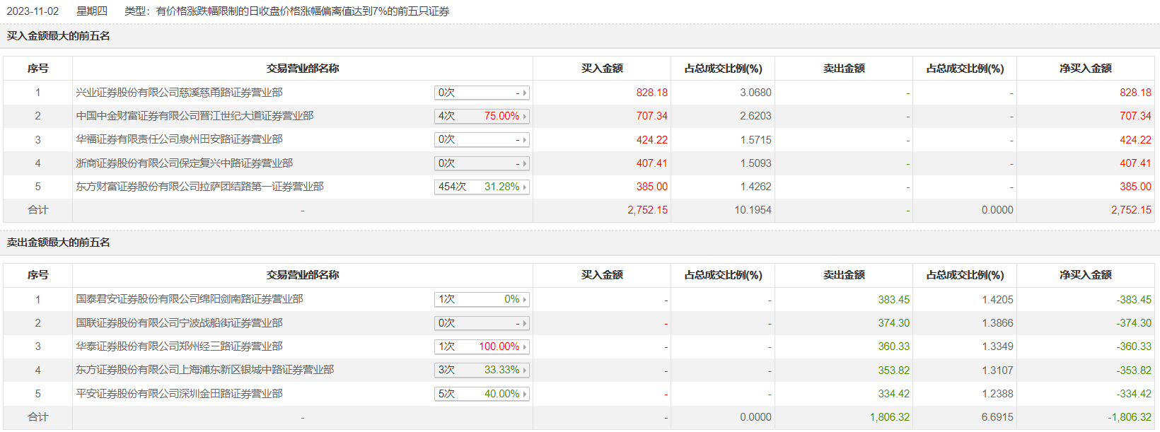 天龙股份11月2日涨停,全天换手率达4.17%,振幅达2.82%。龙虎榜数据显示,营业部席位合计净买入945.84万元。其中,兴业证券慈溪慈甬路证券营业部、中国中金财富证券有限公司晋江世纪大道证券营业部分别买入828.18万元、707.34万元;国泰君安证券绵阳剑南路证券营业部、国联证券宁波战船街证券营业部分别卖出383.45万元、374.30万元。