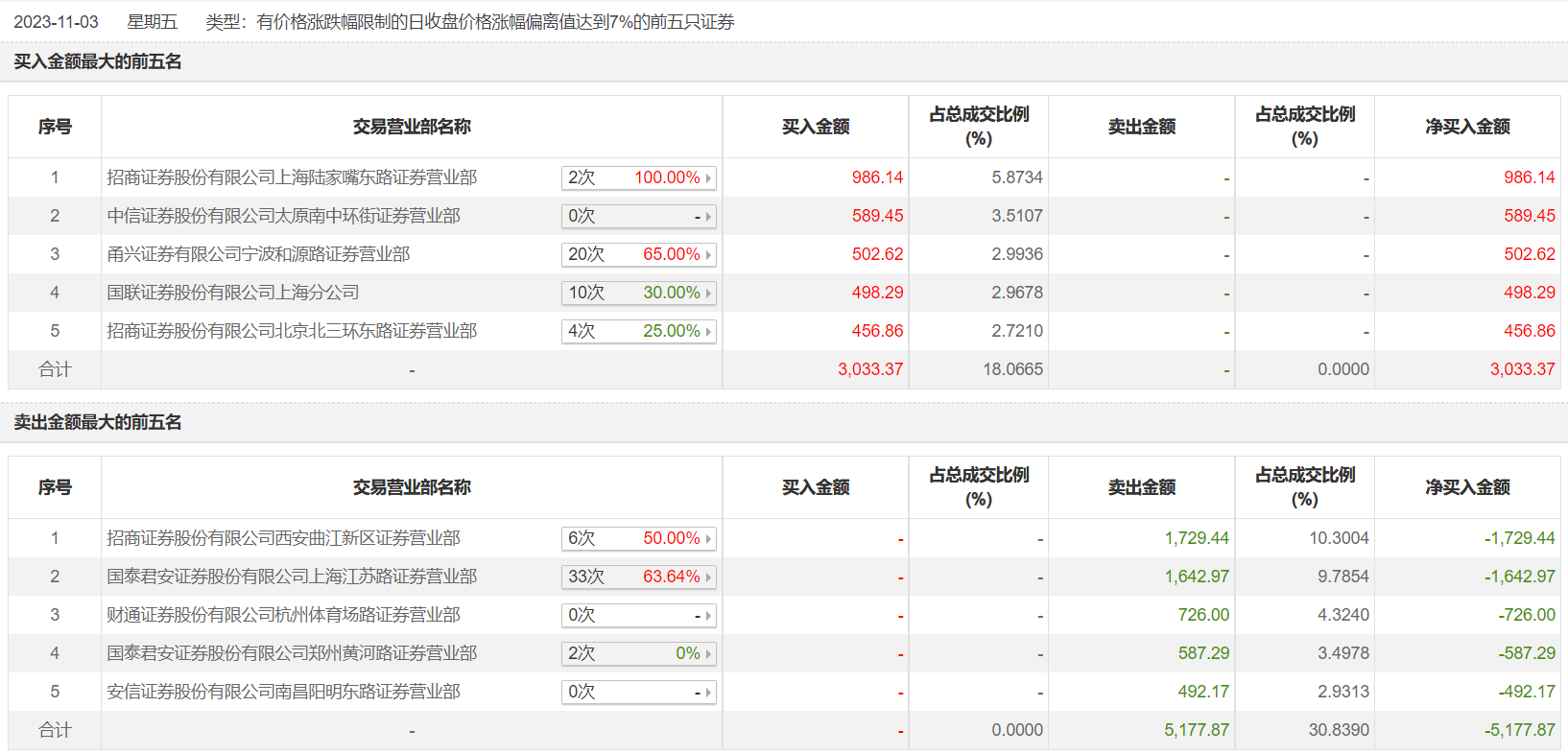 天龙股份11月3日涨停,龙虎榜数据显示,上榜营业部席位全天成交8211.24万元,占当日总成交金额比例为48.91%。其中,买入金额为3033.37万元,卖出金额为5177.87万元,合计净卖出2144.51万元。