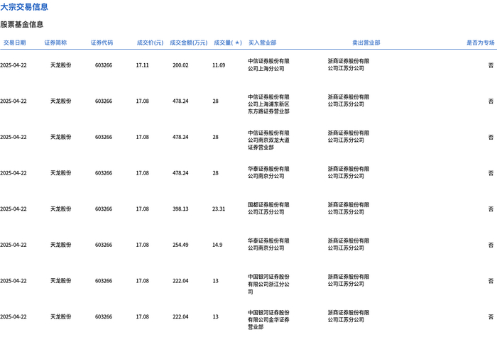 4月22日,天龙股份大宗交易成交198.9万股,成交额3397.56万元,占当日总成交额的12.3%,成交均价17.08元,较市场收盘价19.18元折价10.94%,其中最高成交价17.11元,最低成交价17.08元。