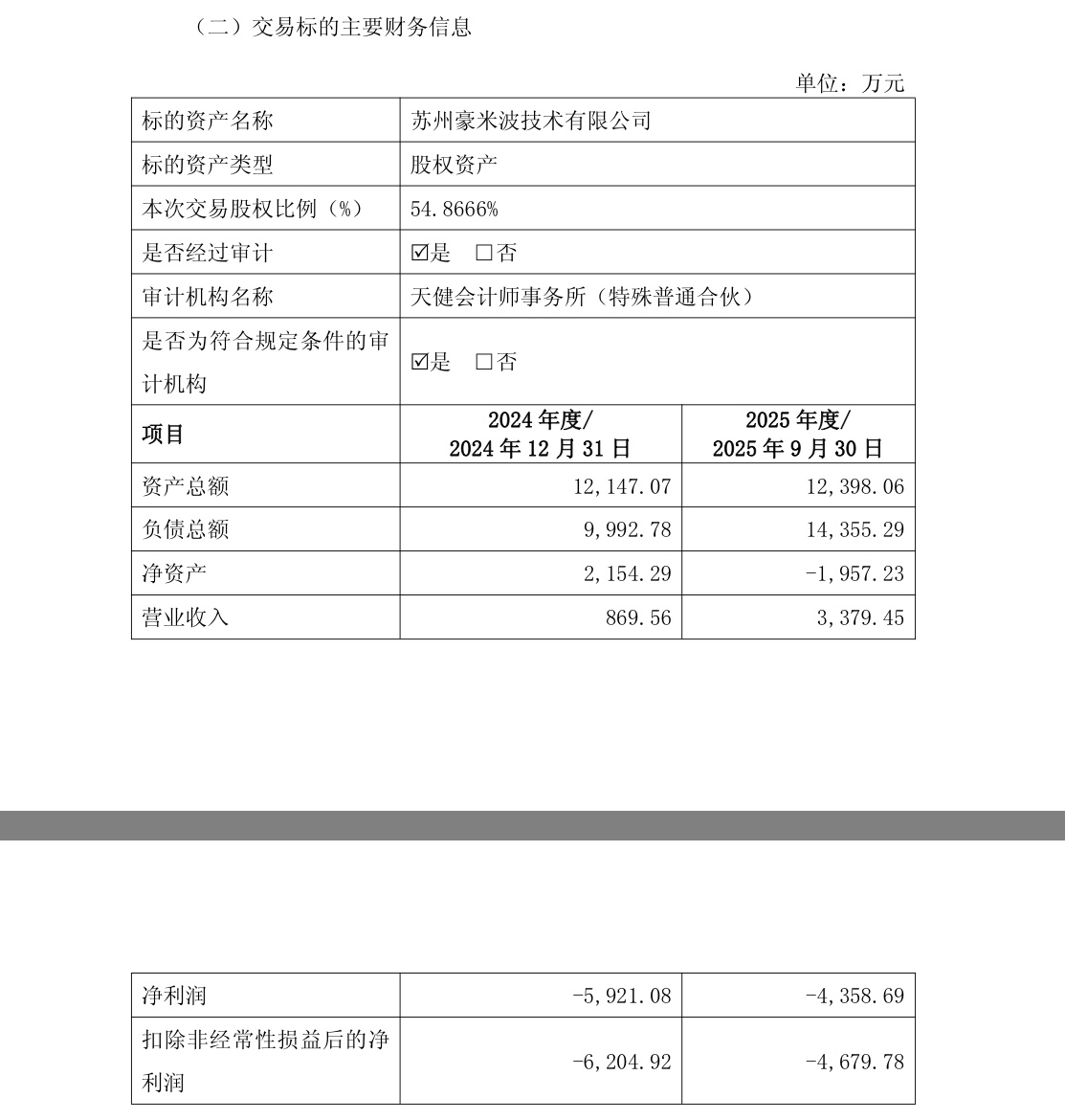 公告显示,2024年苏州豪米波研发费用3406.38万元,2025年1月-9月研发费用2204.72万元,研发费投入较大,导致阶段性亏损。随着智能驾驶的快速发展,定点项目规模化量产,2025年1月-9月份苏州豪米波实现营收3379.45万元,较2024年全年增长288.64%,亏损有所收窄,后续随着营收规模的不断增长,产能利用率提升,单位成本的摊薄,预计经营业绩会持续改善。