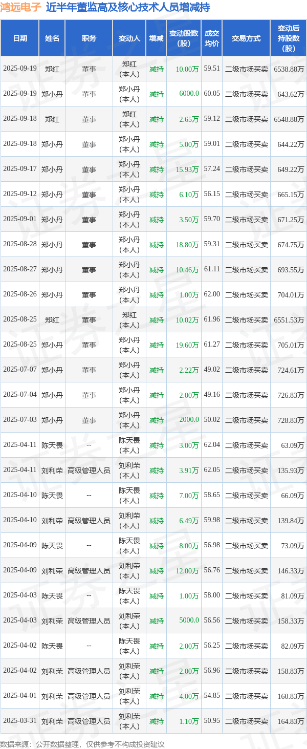 鸿远电子近半年内的董监高及核心技术人员增减持详情如下: