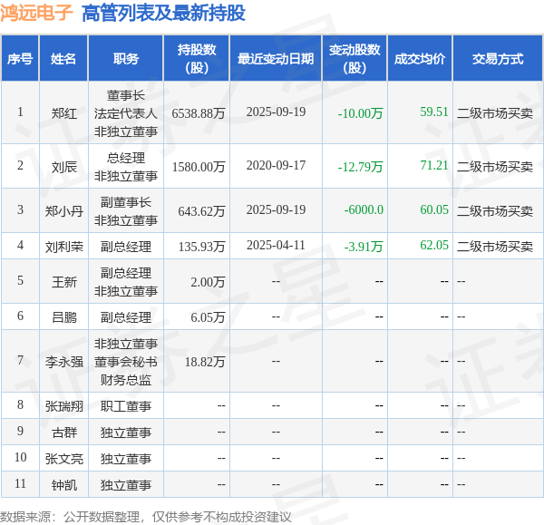 鸿远电子的高管列表及最新持股情况如下: