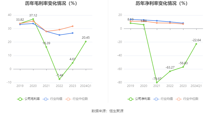 2024年第一季度,公司毛利率为20.45%,同比上升29.23个百分点;净利率为-22.64%,较上年同期上升36.16个百分点。