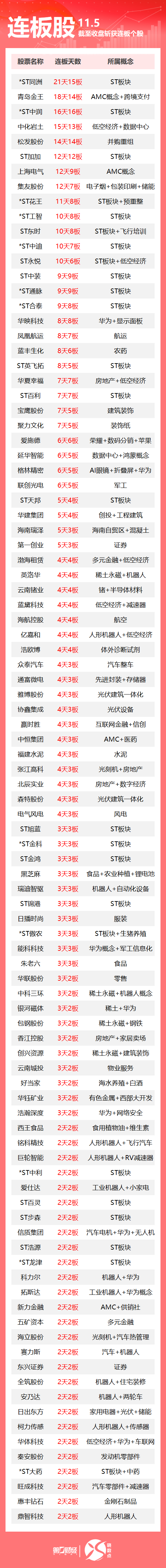 11月5日,Wind数据显示,A股市场共计217只个股涨停。其中并购重组概念股松发股份收获14连板,华为概念股华映科技8连板,地产股华夏幸福7连板,ST板块多股连板。一图速览今日连板股>>