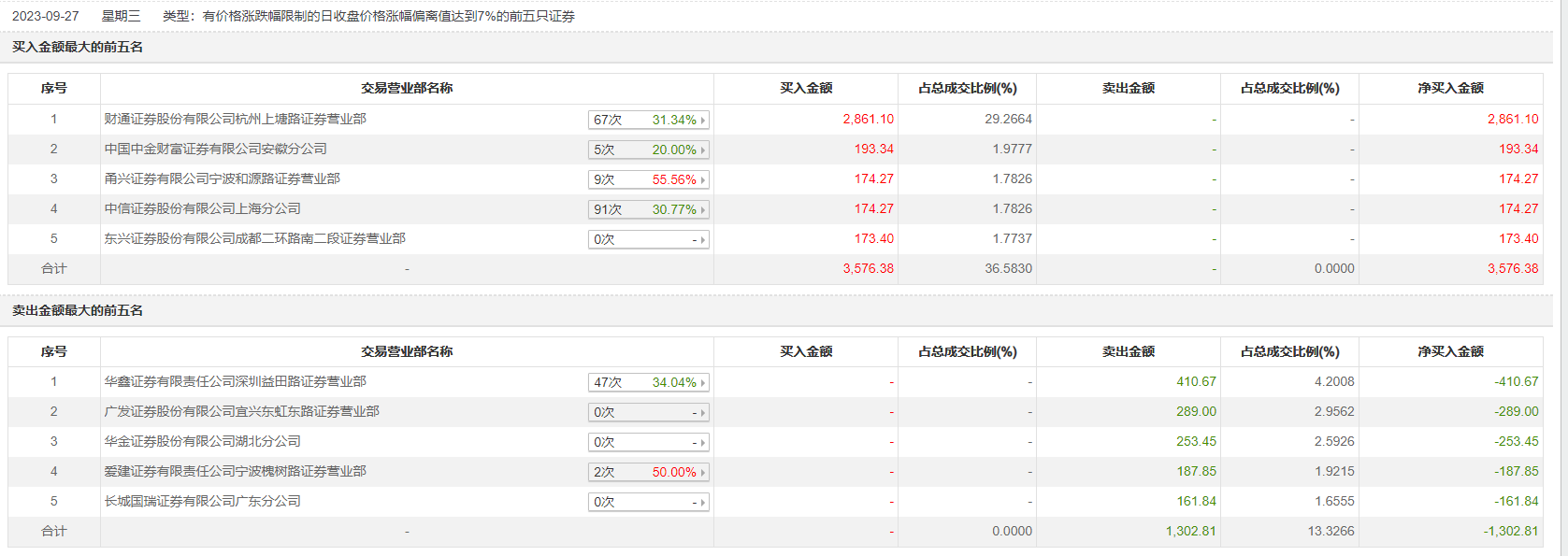 9月27日,南方路机今日涨停,全天换手率达12.48%,振幅达0%。龙虎榜数据显示,营业部席位合计净买入2273.56万元。其中,财通证券杭州上塘路证券营业部、中国中金财富证券有限公司安徽分公司分别买入2861.10万元、193.34万元;华鑫证券深圳益田路证券营业部、广发证券宜兴东虹东路证券营业部分别卖出410.67万元、289万元。