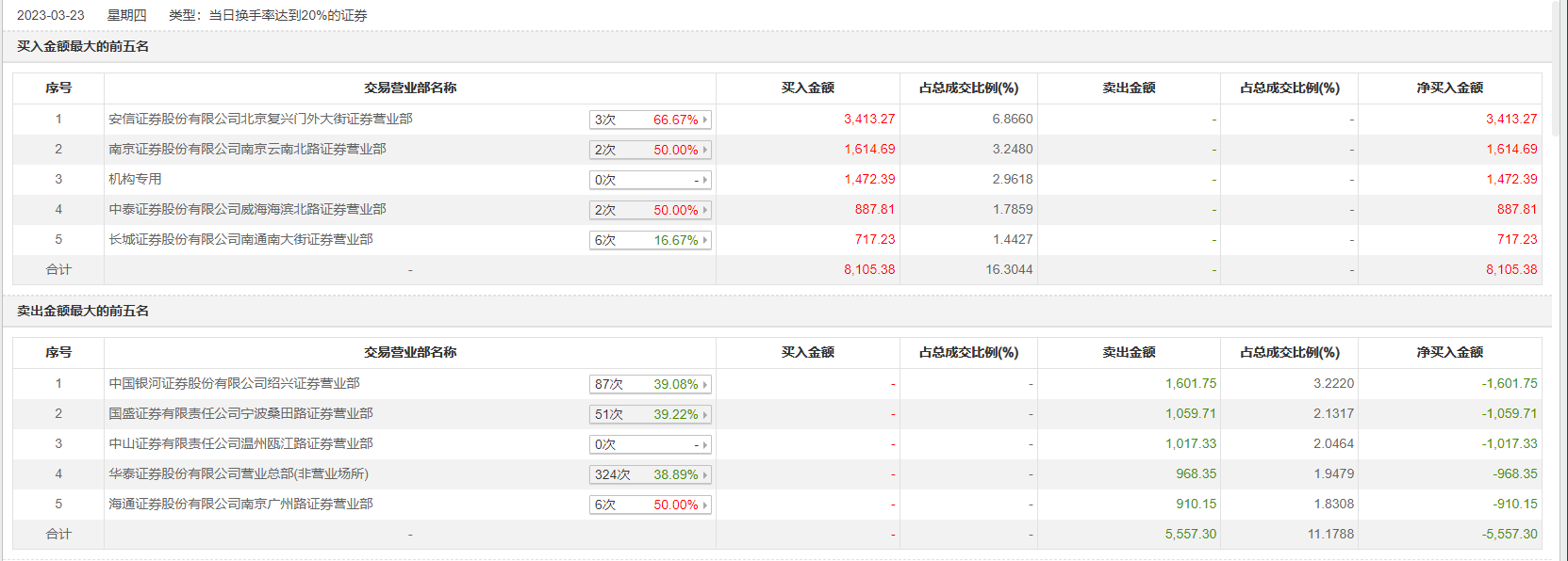 具体来看,机构合计净买入1472.39万元。此外,知名游资现身龙虎榜,赵老哥(中国银河证券绍兴证券营业部)、宁波桑田路(国盛证券宁波桑田路证券营业部)分别卖出1601.75万元、1059.71万元;安信证券北京复兴门外大街证券营业部、南京证券南京云南北路证券营业部分别买入3413.27万元、1614.69万元。