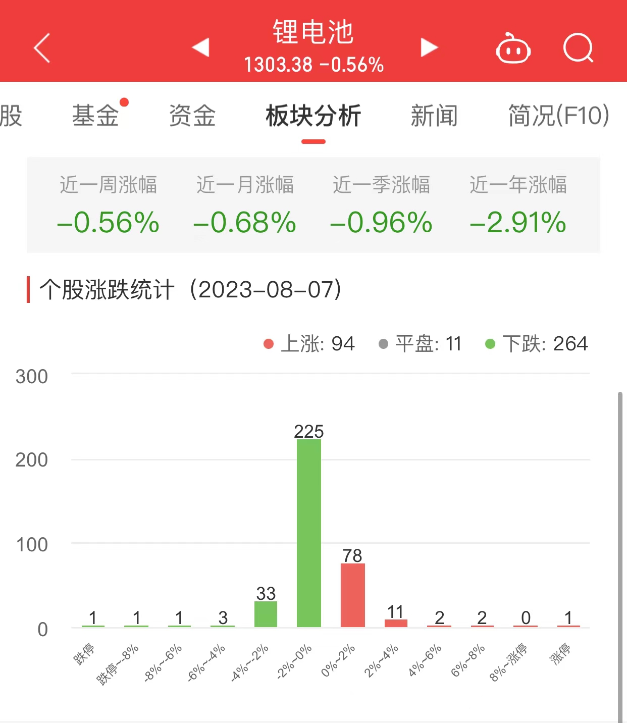 中国经济网北京8月7日讯今日,锂电池板块整体跌幅0.56%,其中94只股票上涨,11只股票平盘,264只股票下跌。