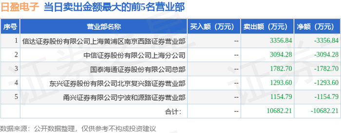 证券之星消息,沪深交易所2025年10月13日公布的交易公开信息显示,日盈电子(603286)因有价格涨跌幅限制的日收盘价格跌幅偏离值达到7%的前五只证券登上龙虎榜。此次是近5个交易日内第1次上榜。
