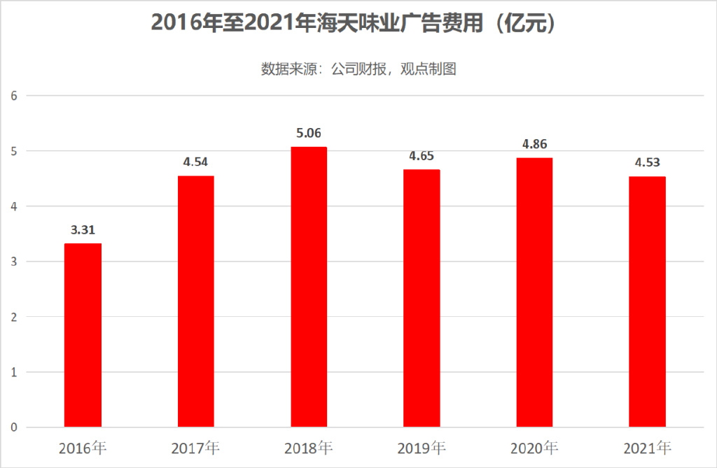 猛砸营销的背后,是广告费用的攀升。财报显示,2016年至2021年,海天味业的广告费依次为3.31亿元、4.54亿元、5.06亿元、4.65亿元、4.86亿元、4.53亿元。