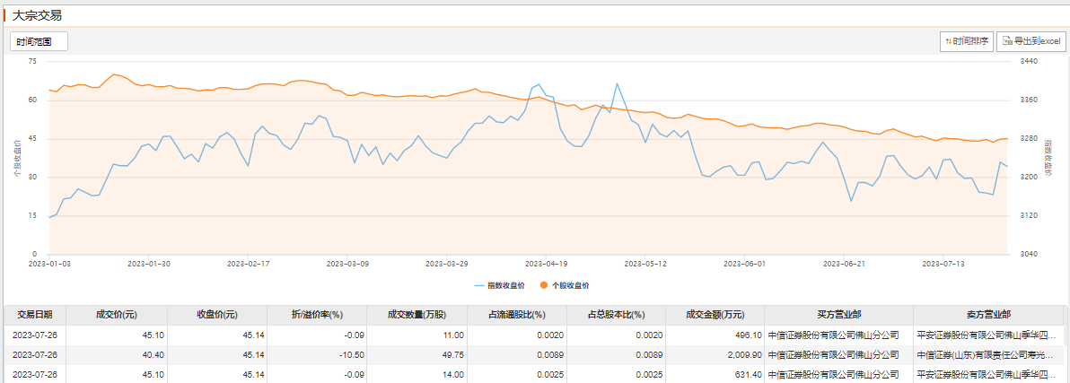 海天味业7月26日大宗交易成交74.75万股,成交额3137.4万元,占当日总成交额的5.96%,成交均价41.97元,较市场收盘价45.14元折价7.02%,其中最高成交价45.1元,最低成交价40.4元。
