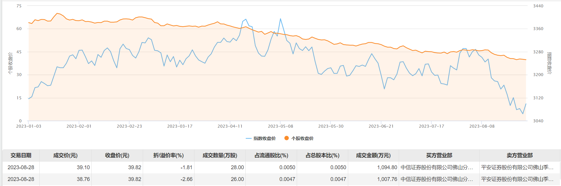 海天味业8月28日大宗交易成交54万股,成交额2102.56万元,占当日总成交额的2.56%,成交均价38.94元,较市场收盘价39.82元折价2.21%,其中最高成交价39.1元,最低成交价38.76元。