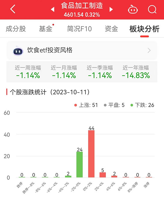 中国经济网北京10月11日讯 今日,食品加工制造板块整体涨幅0.32%,其中,51只股票上涨,5只股票平盘,26只股票下跌。